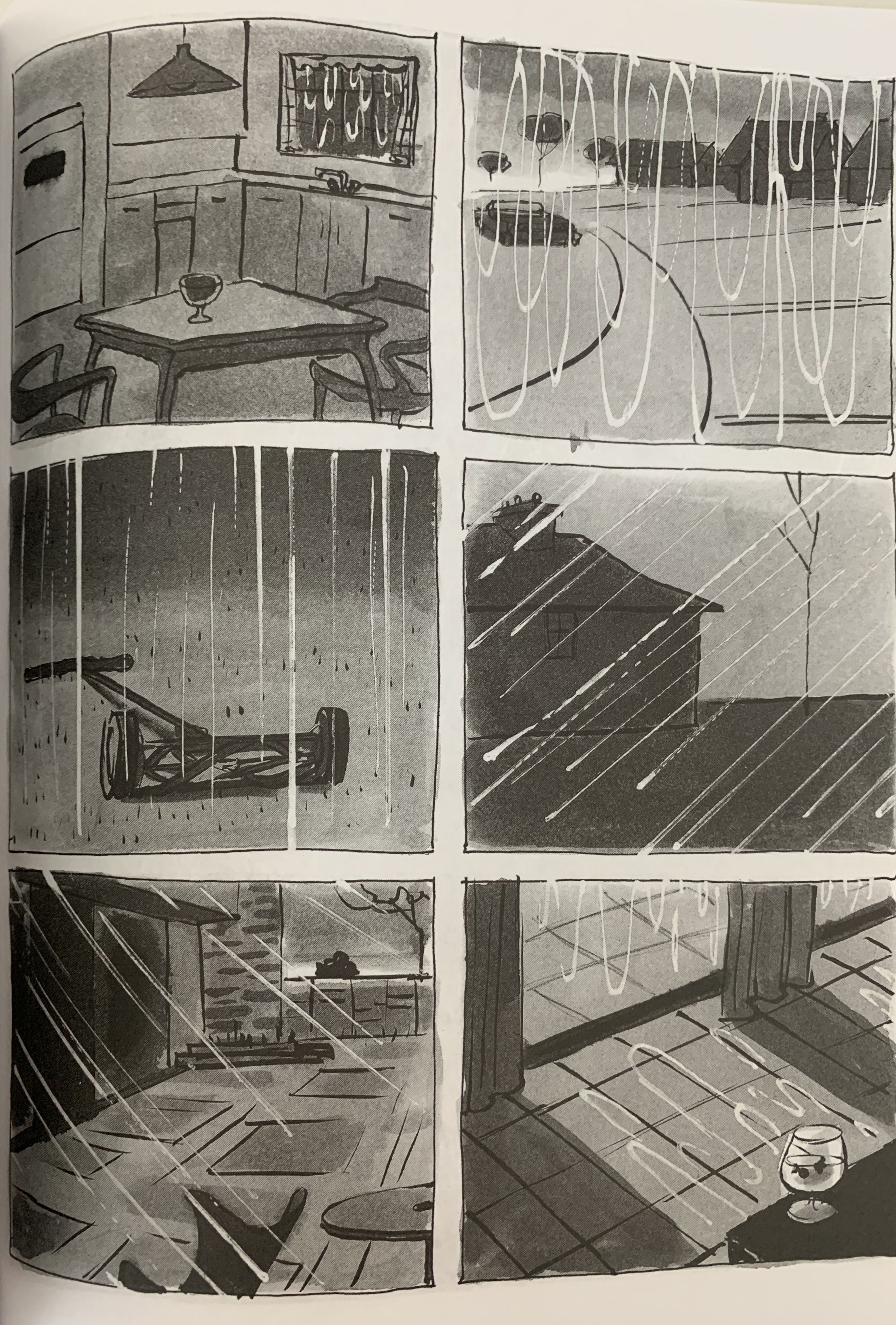 Se ve en el dibujo su cara, se sabe perfectamente lo que debiera estar pensando: molestia, rabia al médico, dolor. Pero luego vienen casi tres páginas de escenas de una tormenta, nada fantástico, una tormenta que pudiera ser en ese momento fuera del consultorio y que te da a entender con una claridad meridiana lo que pasa en su alma, en su corazón, en sus pensamientos en ese momento.